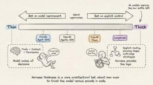 - Độ dày của harness. Bao nhiêu logic nằm trong harness so với model. Anthropic đặt cược vào thin harness và cải tiến model. Các framework dựa trên graph đặt cược vào explicit control. Anthropic thường xuyên xóa các bước planning khỏi harness của Claude Code khi các phiên bản model mới nội tại hóa năng lực đó.