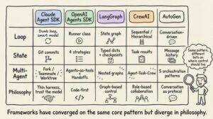 CrewAI triển khai kiến trúc multi-agent dựa trên vai trò: Agent (harness bao quanh LLM, được định nghĩa bởi role, goal, backstory và tools), Task (đơn vị công việc), và Crew (tập hợp các agent). Tầng Flows của CrewAI thêm “backbone xác định với trí thông minh ở nơi quan trọng,” quản lý routing và validation trong khi Crew xử lý cộng tác tự chủ.