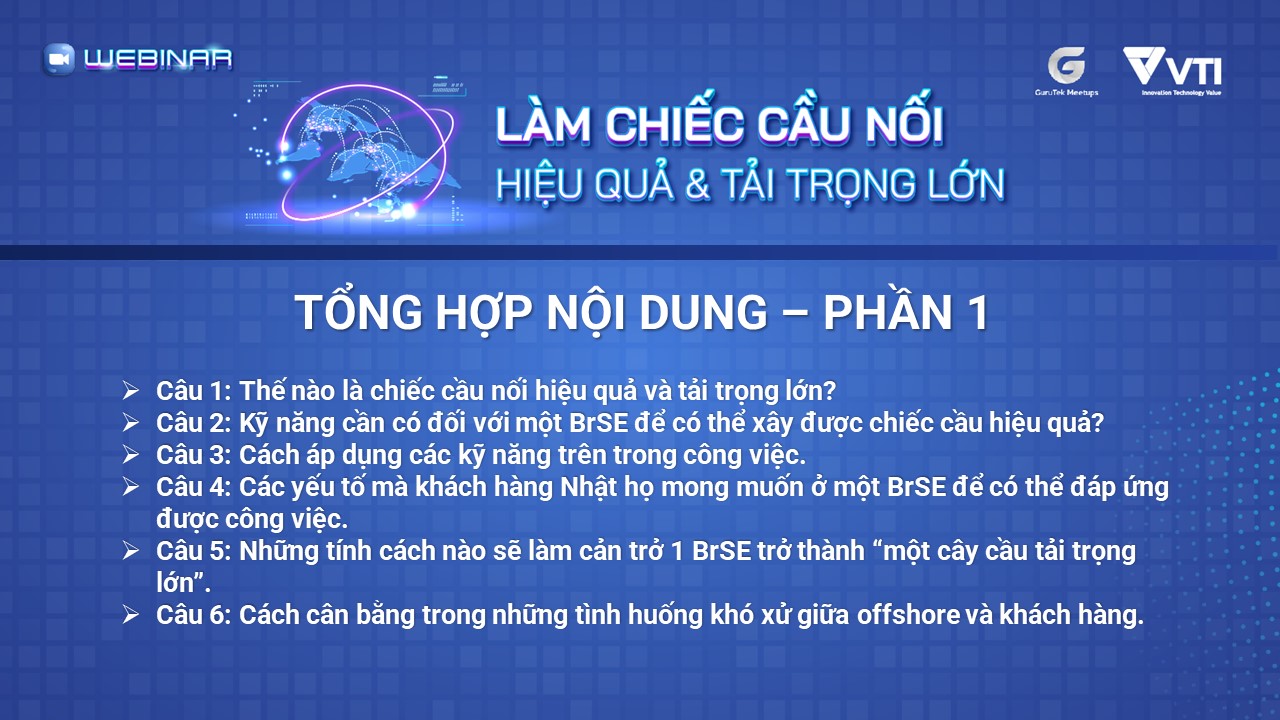 Chào cả nhà, chúng mình là thành viên của team event VTI Japan. Dưới đây là bài viết mang tính chất tóm tắt nội dung của sự kiện Gurutek Meetups mà chúng mình mới tổ chức trong tháng 6 vừa rồi. Rất hy vọng sẽ đem lại cho các bạn những nội dung hữu ích có thể áp dụng trong sự nghiệp BrSE (Kỹ sư cầu nối). Bài viết có chèn thêm cảm nhận của chúng mình nên các bạn thông cảm nha!!!